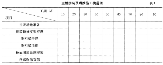 事件4:主桥拼装及顶推施工计划总工期为90d,按拼装场地准备(10d)、拼装顶推支架搭设(20d)、钢桁梁拼焊(50d)、钢桁梁顶推(50d)、桥面附属设施安装(50d)、落梁拆除支架(10d)共六个主要工作控制施工,其中拼装场地准备与拼装顶推支架搭设可同时开工,钢桁梁顶推在钢桁梁拼焊10d后方可开始,桥面附属设施安装比钢桁梁顶推推迟10d开工。施工单位拟按表1格式绘制主桥拼装及顶推施工横道图。